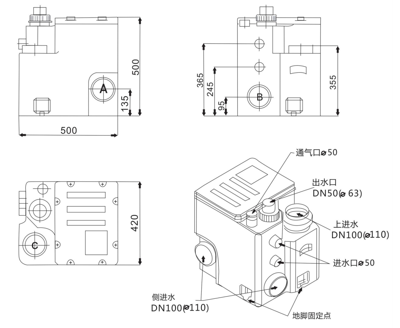 耐腐蚀性PE箱体,完全密闭,无异味散发,经久耐用,可在狭小的空间内安装使用。水泵耦合连接、维修便捷,多个进水口,安装方便,内置不锈钢止回阀。内置切割型潜污泵,适用多种复杂环境。控制器特点:水泵空载保护、可设置延时启动/停止,水泵过载保护、高抗干扰性能,高位报警强启、手动/自动切换、自动巡检等功能。