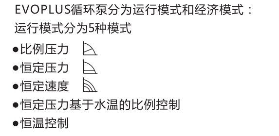 新型EVOPLUS循环泵采用了先进的技术-永磁同步电机和变频器,从而确保在各种应用环境下的高效率,具有显 著的节能效果;新型EVOPLUS循环泵符合欧盟ErP 2009/125/EC(旧版EuP)2015o其特点是内置集成温度和压力传感器,可检测采暖系统需求变化并自动调整循环泵性能从而始终确保最佳效率和最低能耗。