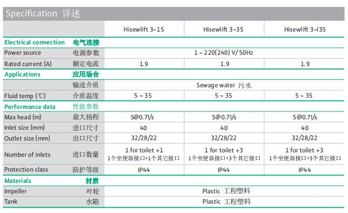 最大扬程:5@0.7l/s;进口数量:1个坐便器接口+3个其他接口;进口尺寸:DN40/DN110;出口尺寸:DN22/28/32;防护等级:IP44