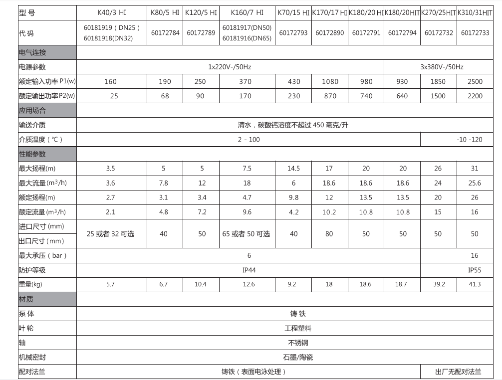 感应电机感应电机,结构紧凑,风扇自冷,自润滑密封轴承,噪音低,寿命长;单相带有埋入式热保护器和启动 电容,三相电机能效符合IE2标准,效率高;带有热保护器和启动电容,电机能效等级高;泵体、支架和法兰表面电 泳处理,防腐性能高,水力性能优,符合CCC标准(K270/25HIT,K310/31HIT未包含),24个月的保修期。
