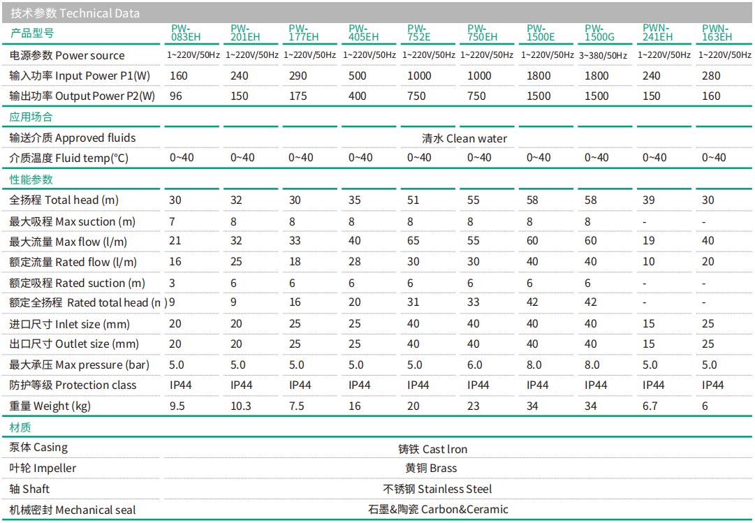 泵体:铸铁;叶轮:黄铜;轴:不锈钢;机械密封:石墨&陶瓷